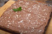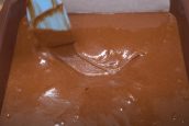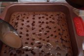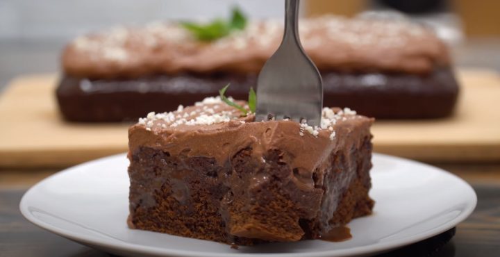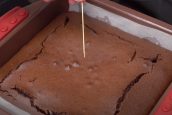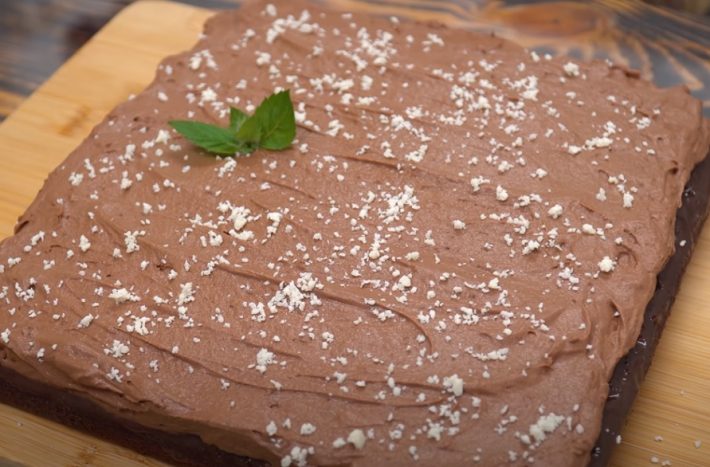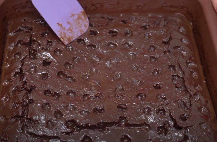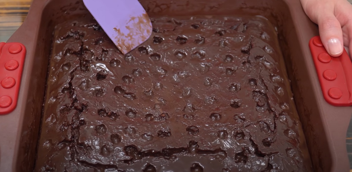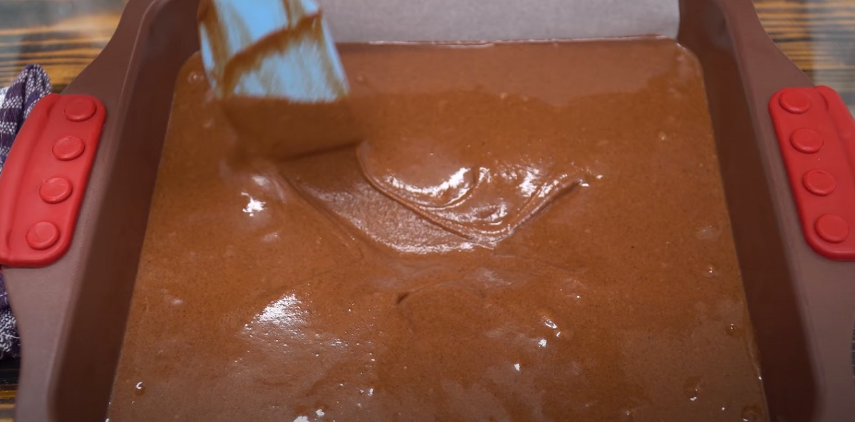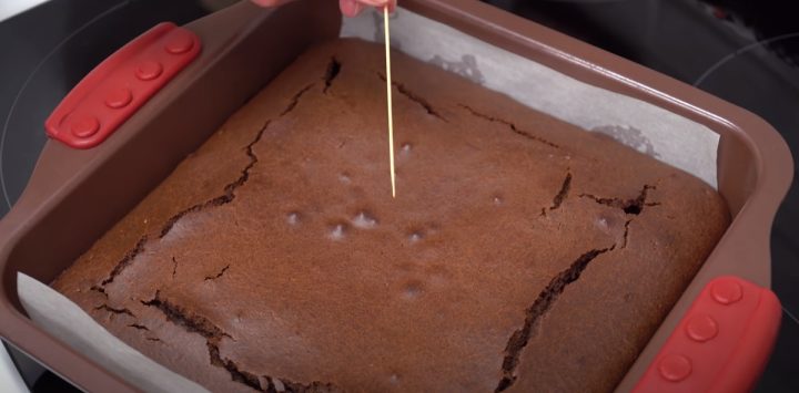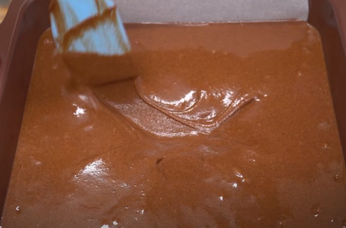 Vyložte plech na pečení pečicím papírem a vlijte do něj připravené kakaové těsto. Stěrkou uhlaďte povrch do roviny, do středu těsta nakreslete naplocho špachtlí X (díky tomu se těsto příliš nenafoukne) a vložte do předehřáté trouby péct po dobu 30 minut.