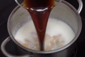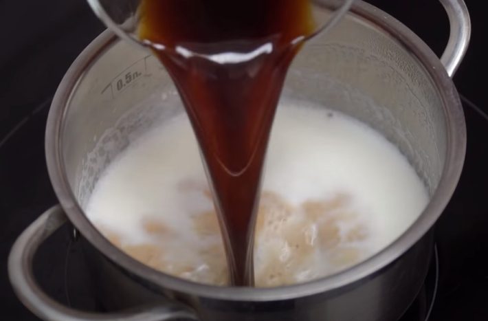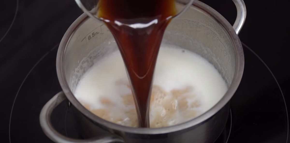 Zatímco těsto chladne, připravte sirup. Do hrnce nalijte mléko s kávou a přiveďte k varu.