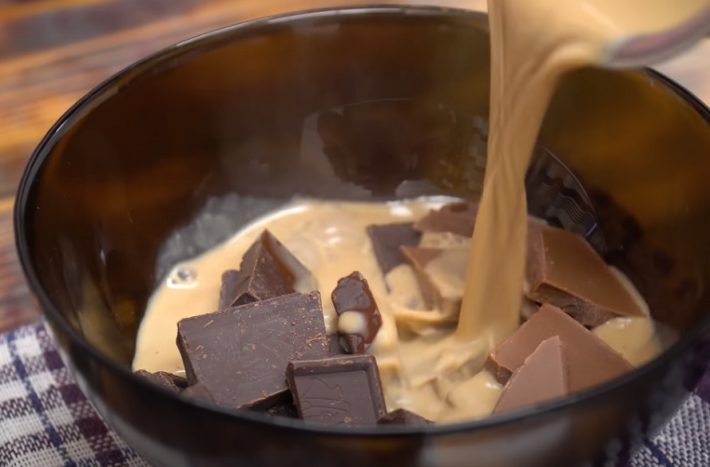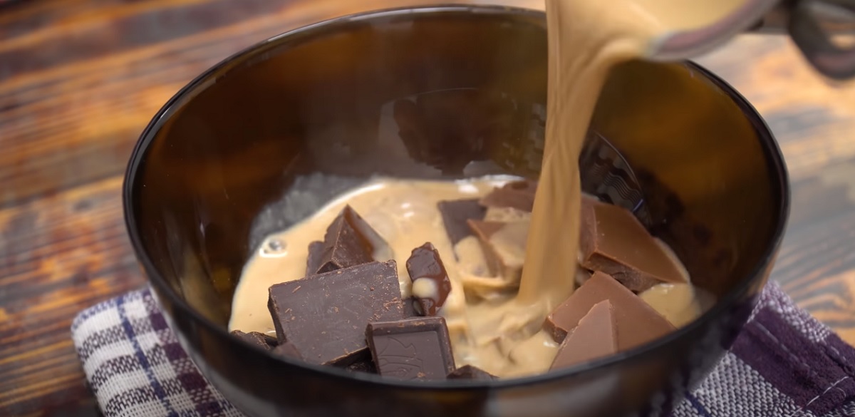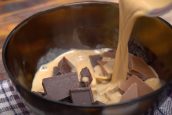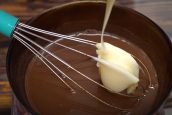 Přidejte na kousky nalámanou čokoládu a nechte půl minuty až minutu zahřívat, aby se rozpustila.