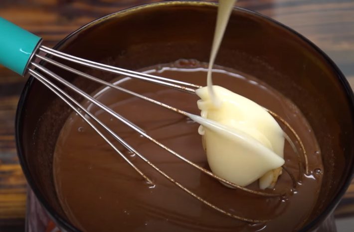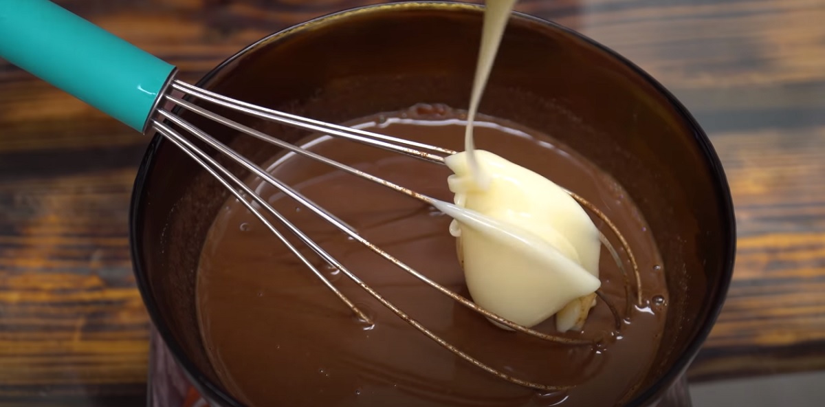 Poté rozmíchejte dohladka. Pak přilijte kondenzované mléko a znovu promíchejte.
