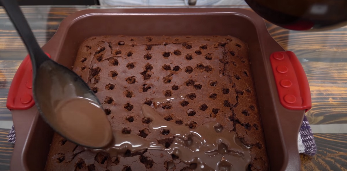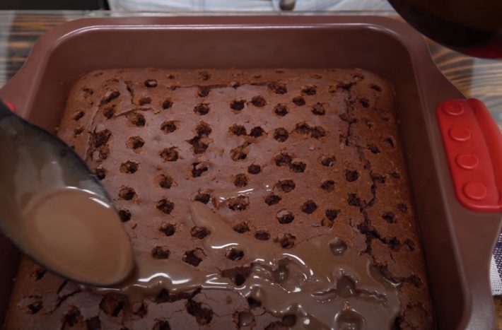 Vložte vychlazený korpus zpátky do plechu s pečicím papírem. Koncem vařečky nebo lžíce vytvořte na ploše korpusu rovnoměrně díry – spoustu děr, do kterých nalijte hotový sirup.