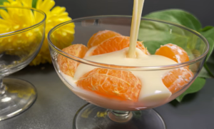 Na dno pohárků či skleniček položte jeden nebo dva měsíčky mandarinky a polijte je smetanovou směsí tak, aby byly celé ponořené. Pak po obvodu vyskládejte opět kroužek mandarinek a jednu položte doprostřed. Znovu vše zalijte vrstvou krémového dezertu. Vložte ještě několik kousků, které vyplní mezery, dolijte krém až po okraj a vložte do lednice zchladit alespoň na 30 minut.