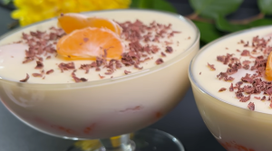 Vychlazené dezerty vyndejte z lednice ven, na povrch hladiny doprostřed dezertu položte dva ozdobné měsíčky mandarinky a zasypejte vše hoblinkami tmavé strouhané čokolády. Nyní už stačí pohárky vyrovnat na stůl s nabídkou občerstvení a počkat na chválu a ódy od ohromených hostů.