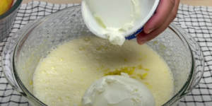 Do velké mísy rozklepněte vejce, přidejte cukr, vanilkový cukr a míchejte mixérem, dokud nezískáte nádherně krémovou konzistenci. Nastrouhejte citronovou kůru a přidejte ji do mísy. Nyní přidejte smetanový sýr a důkladně promíchejte stěrkou.