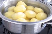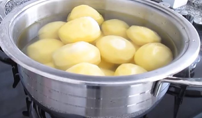 Brambory oloupejte a důkladně omyjte pod tekoucí vodou. Uvařte brambory doměkka v lehce osolené vodě, a když jsou připravené, slijte je a nechte úplně vychladnout.