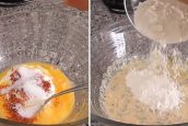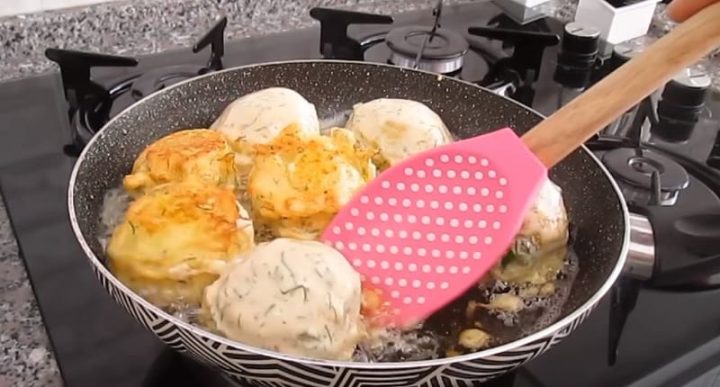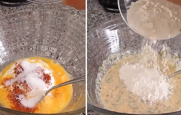 Mezitím, co uvařené brambory chladnou, připravte si ochucené těstíčko na obalení. Do hlubší mísy rozklepněte dvě vajíčka a přidejte k nim dvě lžíce smetany, lžičku soli, najemno nasekaný kopr a cibuli nakrájenou na drobné kostičky. Přisypejte ještě červenou papriku a metličkou, vidličkou nebo šlehačem dobře promíchejte. Nakonec do směsi vmíchejte po částech prosátou hladkou mouku a zadělejte na řídké těstíčko.