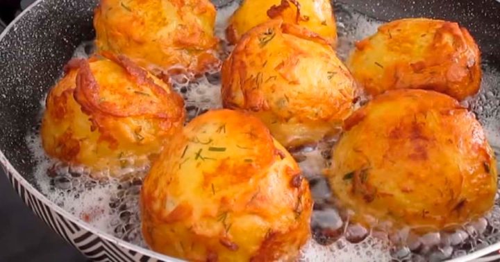 Až bude olej žhavý, obalte každou bramboru v těstíčku a vhoďte do pánve. Smažte obalené brambory po všech stranách, dokud nebudou krásně opečené a zlatavé.