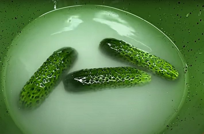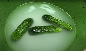 Tři okurky nakládačky (můžete je nahradit 1 polní okurkou nebo zhruba půlkou hadovky) namočte do vody se dvěma lžícemi jedlé sody a nechte je máčet 15 minut. Potom je důkladně vydrbejte a a opláchněte.