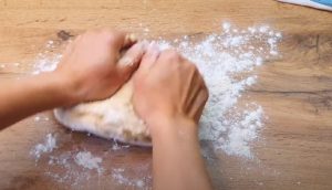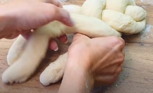 Rozdělte ho na 3 díly a z každého udělejte kouli. Pak těsto mírně roztáhněte do oválu. Následně si vezměte váleček a vyválejte z těsta ještě větší ovál. Z jedné dlouhé strany ho smotejte do dlouhé ruličky a ještě poválejte. Takto zpracujte všechno těsto, z něhož získáte celkem 3 prameny. Ty na konci spojte k sobě a upleťte z nich cop.