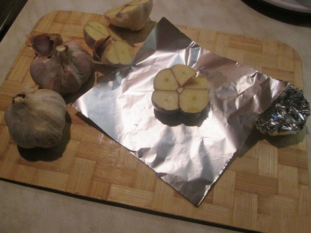 Troubu si předehřejte na 180 °C. Hlavy česneku rozkrojte na polovinu a každý kousek zabalte do alobalu.