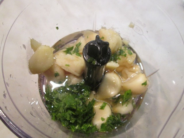 Takto připravené je dejte na plech a nechte v troubě péct asi 30 minut. Poté vytáhněte z trouby a nechtě česnek mírně vychladnout. Poté jej oloupejte a dejte do kuchyňského robota.