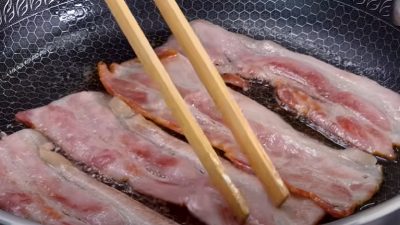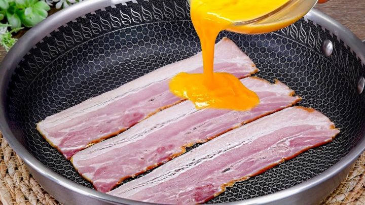 Na pánev s rozpuštěným máslem vyskládejte proužky slaniny, které smažte 1–2 minuty z každé strany. Slaninu zalijte směsí rozšlehaných vajec se solí, pepřem a pokrm smažte další 2–3 minuty, pod pokličkou.