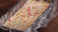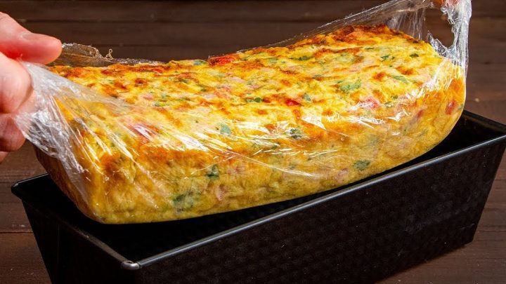 Ingredience důkladně promíchejte a těsto vlijte do formy na pečení, vyložené pečicí fólií, kterou zakryjte i povrch těsta. Omeletu z trouby pečte v předehřáté troubě na 180 °C po dobu 30 minut.