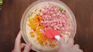 Jakmile se ingredience propojí, vmíchejte do nich nasekanou petrželku s nadrobno nakrájenou paprikou a šunkou.
