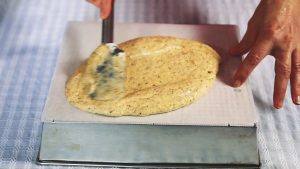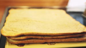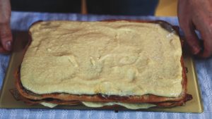 Nejprve připravte těsto. Do mísy vsypte mleté mandle, přidejte moučkový cukr, tři vajíčka, rozpuštěné máslo a škrob a zamíchejte dohladka. Z bílků vyšlehejte tuhou pěnu a během šlehání k ní přidejte 1 lžíci cukru. Výsledný sníh pak stěrkou jemně vmíchejte do mandlové hmoty. Výslednou hladkou hmotu pak rozdělte na tři stejně velké části, každou rozprostřete na plech o rozměrech 20 x 30 cm, vyložený pečicím papírem, a pečte v troubě vyhřáté na 175 °C po dobu 10 až 12 minut. Takto zpracujte všechny tři pláty těsta a po dopečení je nechte vychladnout.
