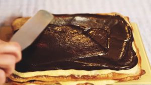 Nyní sestavte dort. Na podnos položte první plát těsta a dobře ho polijte sirupem. Navršte na něj dvě třetiny krému, zakryjte druhým plátem, který opět polijte sirupem a na něj nalijte vrstvu čokoládového ganache. Opět zakryjte plátem těsta, potřete ho sirupem a vložte zbytek krému. Hotový dort vložte do lednice alespoň na 90 minut ztuhnout.