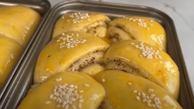 Postup opakujte také se zbytkem ingrediencí. Ořechové buchty potřete směsí vaječného žloutku a másla, posypte je sezamovými semínky a pečte v předehřáté troubě na 170 °C po dobu 40 minut.