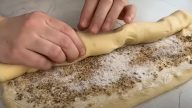 Máslo pokryjte polovinou množství rozmixovaných ořechů, posypte cukrem a těsto zarolujte ze širší strany. Vzniklý váleček rozdělte na kousky o šířce 3–4 cm, které vyskládejte do formy na pečení vymazané olejem.