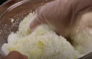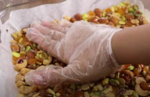 V jedné míse spolu smíchejte pražené mandle, arašídy, kešu ořechy a pistácie. Přidejte k nim rozinky nebo na kousky nakrájené sušené meruňky a zamíchejte. Do druhé mísy nasypejte kokos, přilijte k němu rozpuštěné máslo a pečlivě promíchejte. Pak do kokosu nalijte polovinu sirupu a promíchejte, aby vznikla lepivá hmota. Pokud není dostatečně mokrá, lze přidat malinko kondenzovaného mléka.
