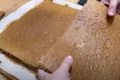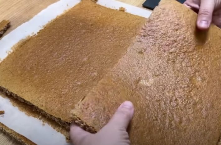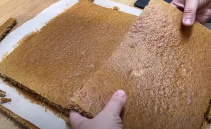 Vložte plech do předem vyhřáté trouby na 180 °C a pečte 25 minut. Po vychladnutí z korpusu odstraňte pečicí papír a dortovým ráfkem o rozměrech 30×20 centimetrů z něj vykrojte 2 stejné kusy. Zbylé odřezky rozdrobte najemno.