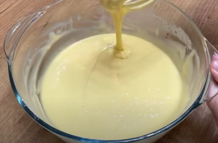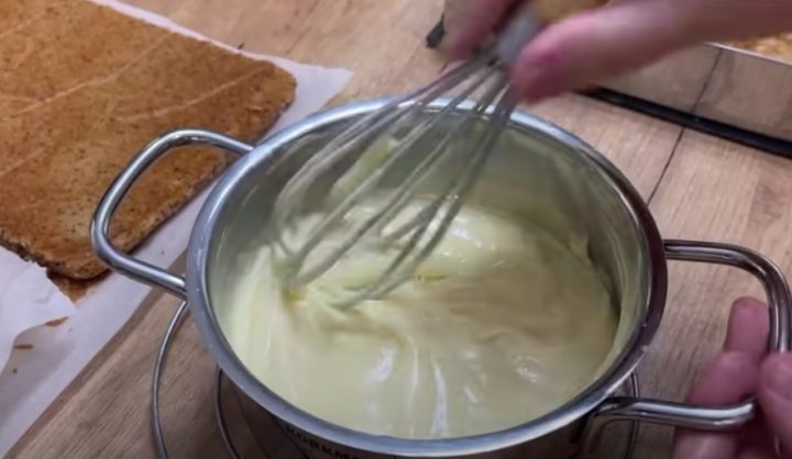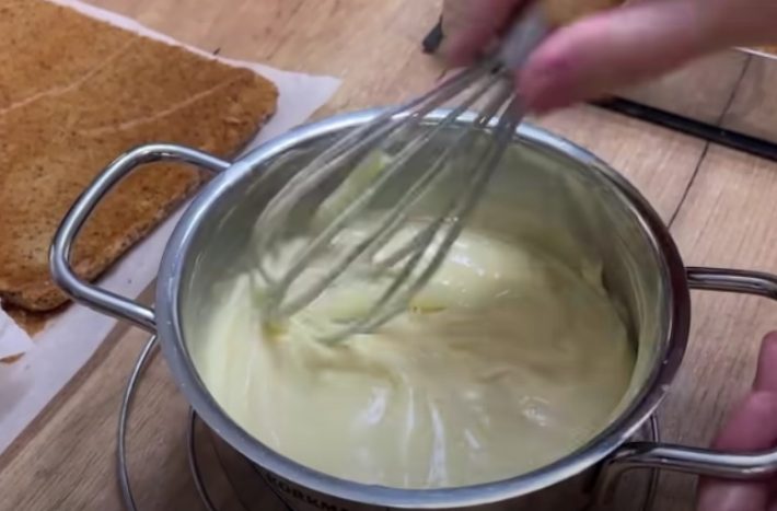 Dejte do hrnce mléko, žloutky, vanilkový cukr, cukr a škrob a míchejte, dokud se nerozpustí. Pak vše za stálého míchání svařte do pudinkové konzistence. Stáhněte hrnec ze sporáku, přidejte máslo a bílou čokoládu a míchejte, dokud se nerozpustí.