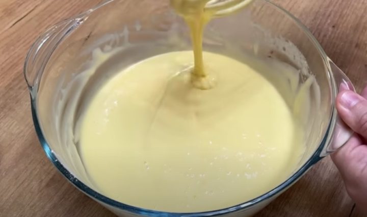 Dejte do mísy vejce, vanilkový cukr a cukr a vyšlehejte do pěny. Poté do směsi zašlehejte mléko, olej a nakonec přimíchejte mouku a prášek do pečiva. Vymíchejte těsto, přidejte do něj mleté vlašské ořechy a dobře promíchejte. Plech o rozměrech 40×30 centimetrů vyložte pečicím papírem a nalijte na něj těsto, které rovnoměrně rozetřete stěrkou.