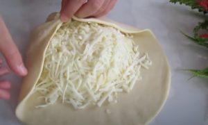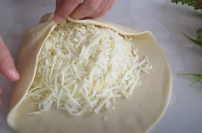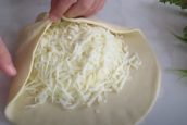 Z těsta vyválejte kruhovou placku. Doprostřed dejte polovinu sýra, ale nechte dostatečné široké okraje. Na vrstvu sýra rozložte bramborovou směs a na ni pak zbytek sýra. Okraje nahoře spojte prsty. Placku dejte spojem dolů, zploštěte ji rukou a trochu rozválejte válečkem na těsto na velikost pánve.