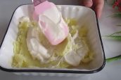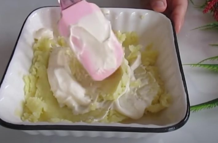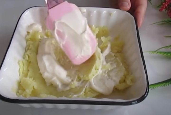 Uvařte brambory do měkka a rozšťouchejte je šťouchadlem na brambory. Přimíchejte k nim majonézu. Sýr si nastrouhejte na hrubém struhadle.