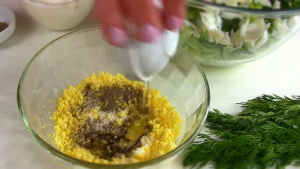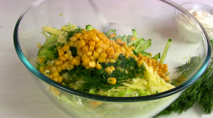 Přidejte sterilovanou kukuřici, jemně nasekaný kopr a zálivku ze zakysané smetany, citronové šťávy a ochucenou solí a pepřem. Vše důkladně promíchejte a podávejte.