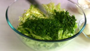 Zelí opět nakrouhejte ostrým nožem na velmi tenké nudličky a vložte je do hluboké mísy. Okurky nakrájejte na plátky, které pak rozdělte na proužky o síle kolem dvou milimetrů. Kopr i koriandr zbavte tuhých stonků a nať nasekejte najemno. Obojí pak přidejte do mísy se zelím a okurkou.