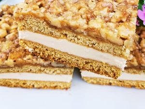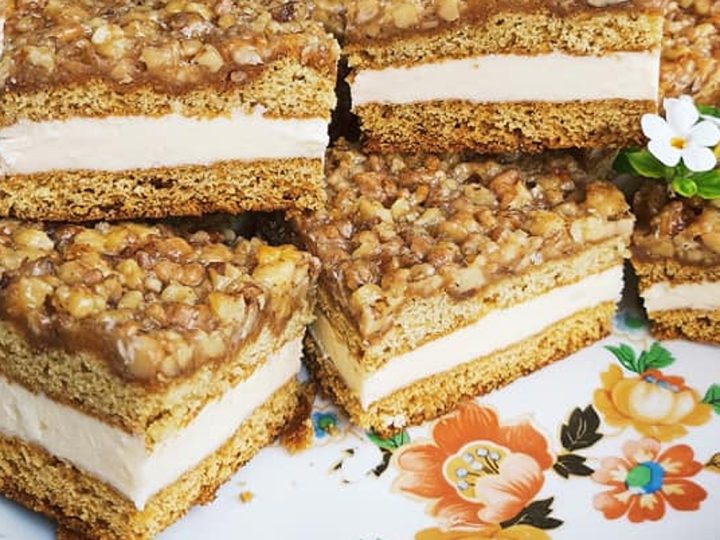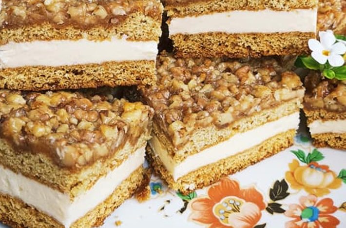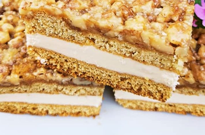 Pokud toužíte zažít doslova „nebe v hubě“, upečte si tyto vynikající řezy s krémem a oříškovo–medovou krustou. Recept na ně nám poskytla paní Jitka Kořánová.