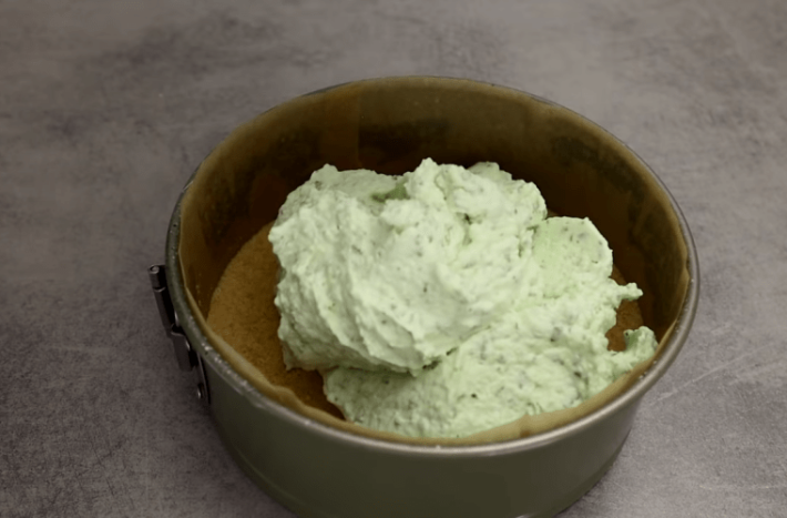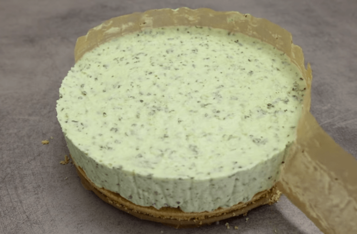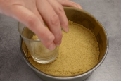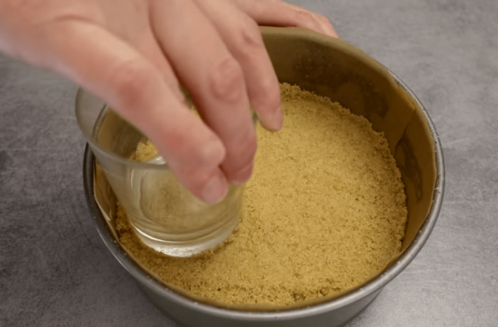 Začněte tím, že si rozmixujete v mixéru na prášek máslové sušenky. Poté je přesypte do mísy a promíchejte společně s rozpuštěným máslem. Hmotu následně navrstvěte do kulaté formy na koláč, kterou jste vystlali pečícím papírem. Pomocí skleničky nakonec zahlaďte dno korpusu.
