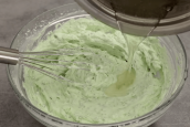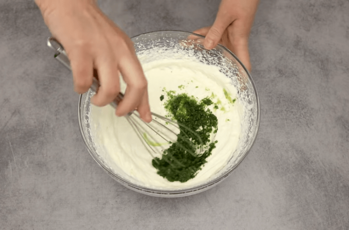 Dále se pusťte do krémové náplně. Nejprve si tedy v míse vyšlehejte smetanu spolu s kondenzovaným mlékem. Poté zakomponujte do směsi mascarpone a také limetovou šťávu, kterou jste rozmixovali spolu s nasekanou mátou. Nakonec ještě vsypte limetovou kůru a důkladně promíchejte.
