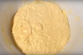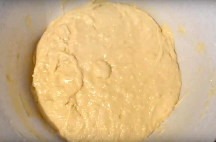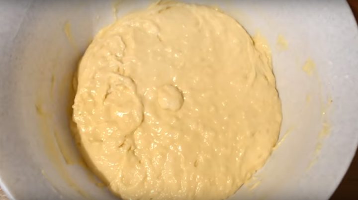 Ve velké míse vyšlehejte vejce spolu s krupicovým cukrem a špetkou soli. Pak přilijte teplé mléko, slunečnicový olej a směs důkladně promíchejte. Postupně do těsta zapracujte i prosetou polohrubou mouku a kypřící prášek. Získáte tak homogenní, hladké a polotekuté těsto.