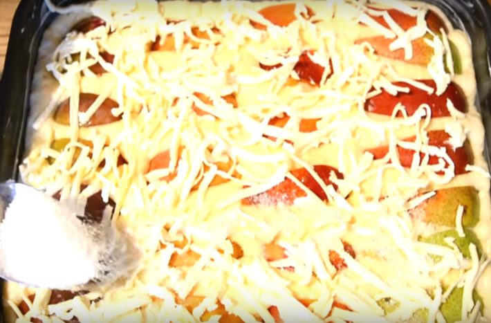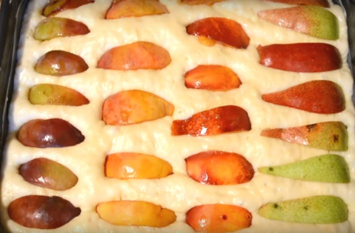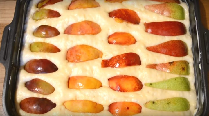 K ruce si posléze vezměte plech, který vystelte pečícím papírem. Vlijte do něj připravené těsto a rovnoměrně jej rozprostřete po celém dnu pekáče. Na jeho povrch poklaďte kousky čerstvého ovoce, které jste si zvolili. Nakonec na ovoce nastrouhejte po celé ploše ještě máslo a posypte cukrem. Na jeho povrchu se tak vytvoří zlatavá karamelizovaná vrstva.