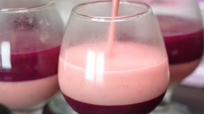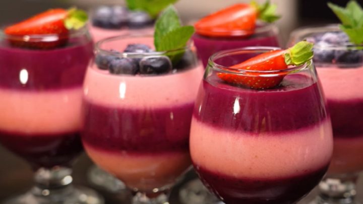 Dno každé sklenice pokryjte trochou borůvkové směsi, na kterou aplikujte vrstvu jahodové směsi. Postup opakujte, dokud budete mít ingredience.