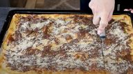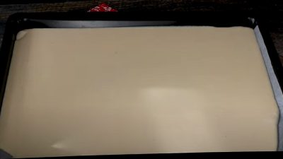 Těsto vylijte na plech, pokrytý pečicím papírem a pečte ho v předehřáté troubě na 200 °C po dobu 18–20 minut.
