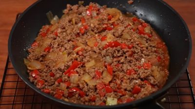 Pokračujte s náplní. Na pánvi s rozpáleným olejem smažte mleté maso 2–3 minuty, do zhnědnutí. Poté k němu přidejte nahrubo nakrájenou cibuli s nadrobno nakrájenou paprikou a prolisovaným česnekem.