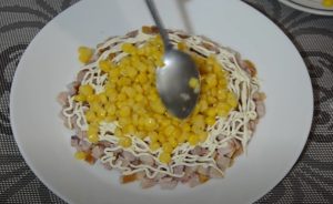 Uzená kuřecí stehna (můžete použít i uzená prsa) oberte, maso nakrájejte na kostičky a rozložte je na talíř. Do sáčku dejte majonézu, ustřihněte růžek, abyste měli malý otvor, a udělejte na mase síťku z majonézy. Na ni dejte kukuřici, pokračujte síťkou z majonézy, vrstvou žampionů a opět majonézou.