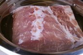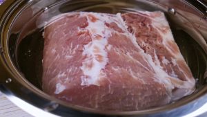 Po uplynutí 3 dnů vyjměte maso ze soli a zbytky krystalků z něj spláchněte pod tekoucí vodou. Pak vložte maso do hrnce a zalijte jej studenou vodou, v níž by mělo zůstat po dobu 3 až 5 hodin, přičemž každých 30 minut vodu vyměňte za novou.