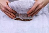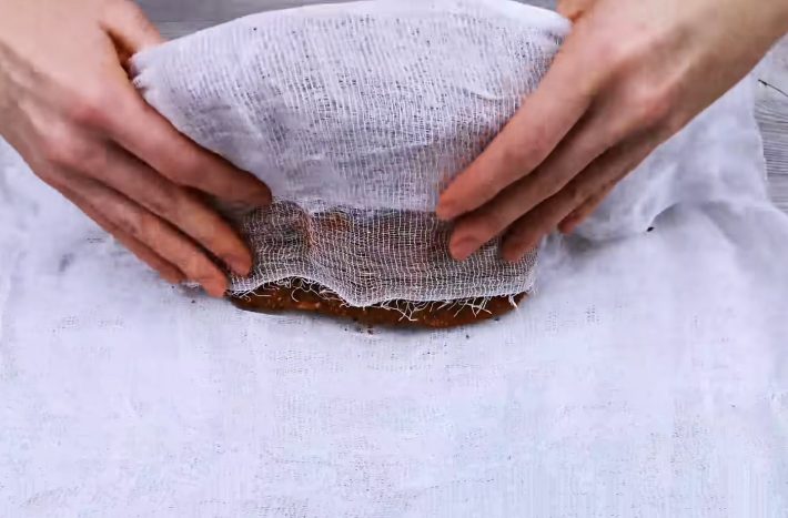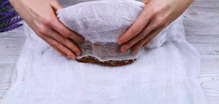 Gázu poskládejte do několika vrstev, aby vytvořila obdélník. Na něj položte maso obalené kořením a zabalte jej do gázy tak, abyste vytvořila na všech stranách masa silnou a nepropustnou vrstvu, skrze níž nebude maso vůbec prosvítat. Gázový balíček s masem pak převažte provázkem tak, aby byly jednotlivé pramínky jen pár centimetrů od sebe a důkladně tak přitiskly gázu na celou plochu masa.