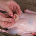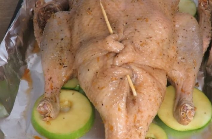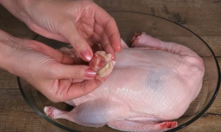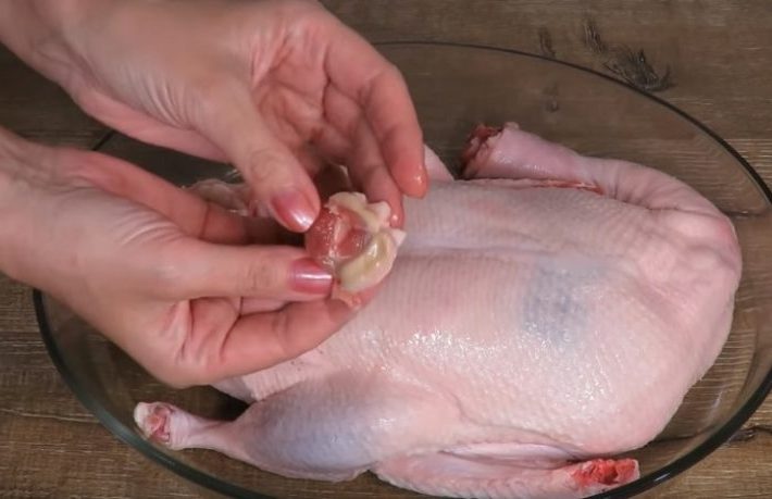 Celou kachnu důkladně umyjte, očistěte ji od zbytků peří a odřízněte ocásek s mazovými žlázami, abyste se vyhnuli specifickému kachnímu zápachu.