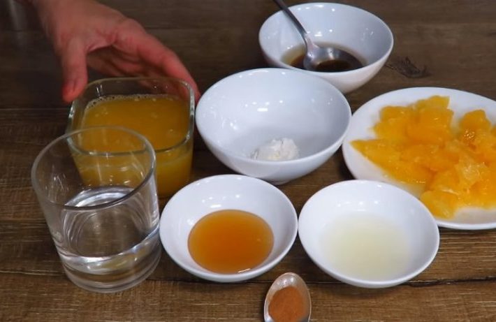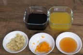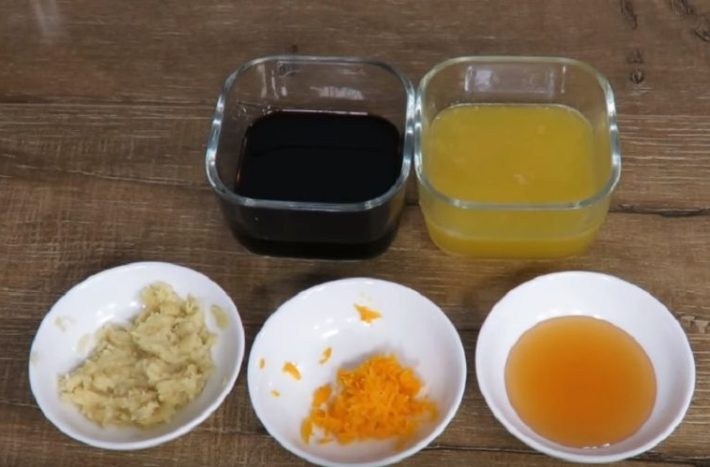 V misce smíchejte 120 mililitrů čerstvé pomerančové šťávy se sójovou omáčkou, přidejte lžíci pomerančové kůry, očištěný a nastrouhaný čerstvý zázvor a 1 polévkovou lžíci medu. Všechny přísady dobře promíchejte.
