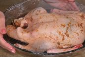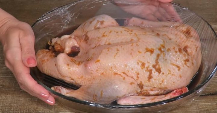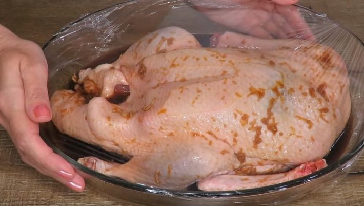 Kachnu vložte do vhodné nádoby a marinádou ji důkladně pomažte zvenčí i zevnitř a případný zbytek marinády přelijte přes ni. Přikryjte nádobu s kachnou přilnavou fólií a dejte ji na 1 den chladit do lednice, aby se maso natáhlo marinádou. Nezapomeňte kachnu v misce pravidelně otáčet, aby se lépe v marinádě proležela.