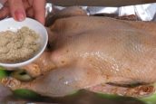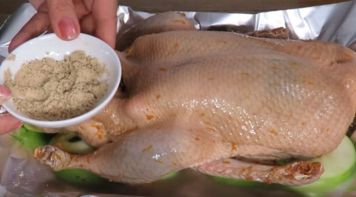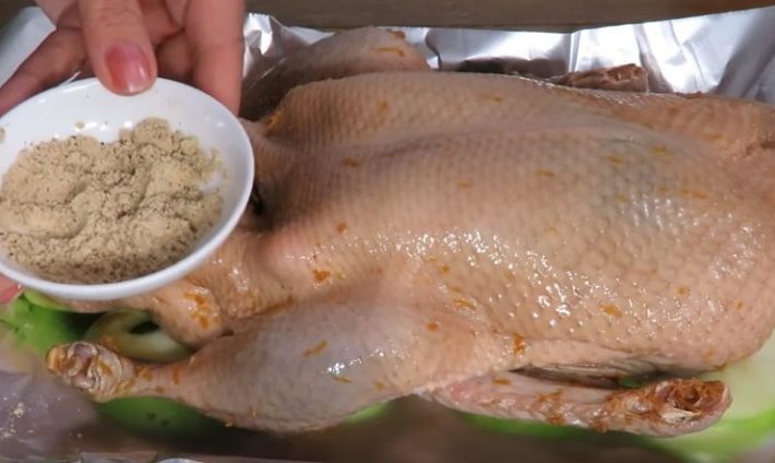 Vyndejte kachnu z marinády a potřete ji směsí červené papriky, sušeného česneku a jedné špičky skořice.