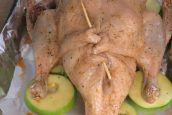 Připravte nádivku: očistěte zbylá jablka a nakrájejte je na plátky. Vhoďte je do misky, přidejte jednu lžíci medu a špetku skořice. Promíchejte, kachnu těmito jablky naplňte a zašijte ji kuchařskou nití nebo zajistěte otvor špejlí. Položte kachnu do pekáče na plátky jablek a zakryjte ji svrchu alobalem.