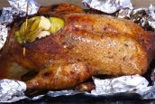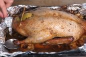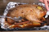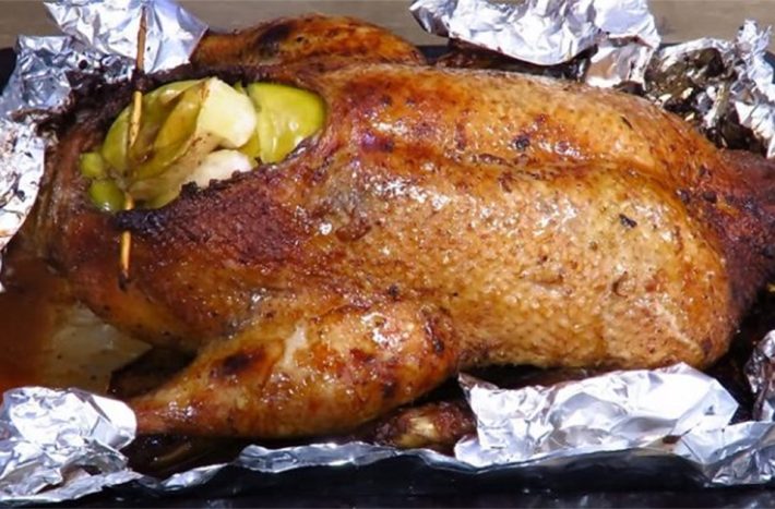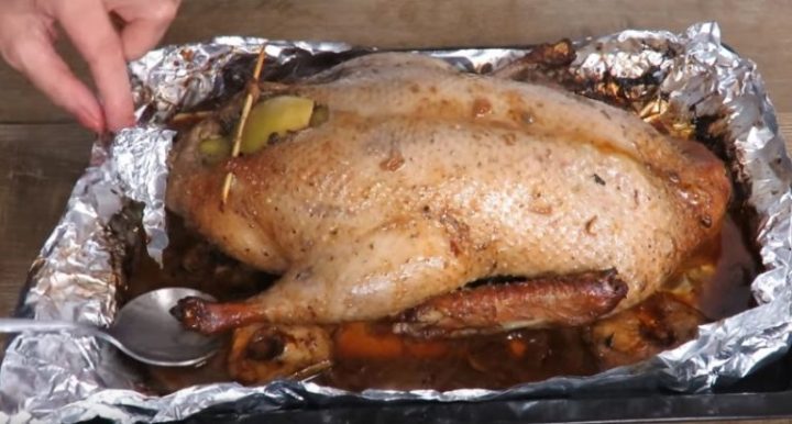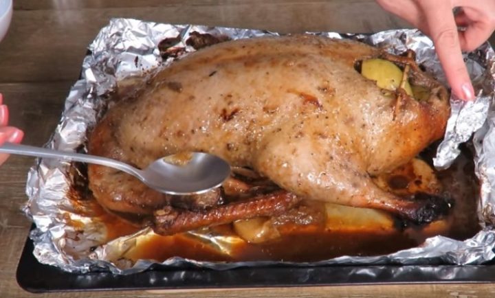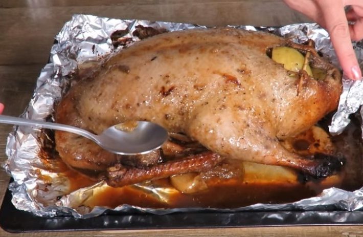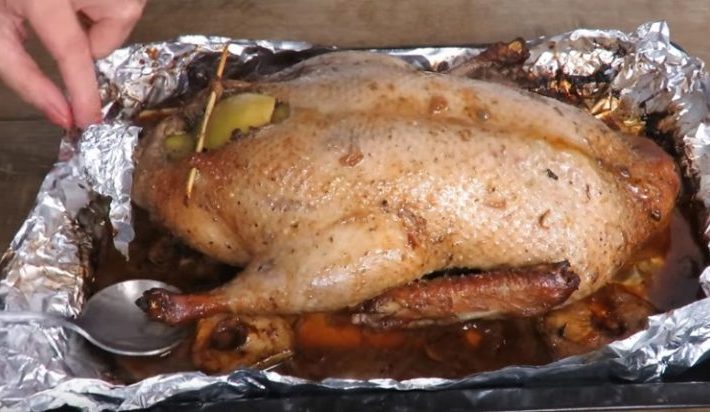 Vložte kachnu péct do předehřáté trouby na 180 stupňů po dobu 2 hodin. Půl hodiny před dopečením kachnu vyndejte z trouby, vyberte z alobalu veškerý výpek, znovu zakryjte alobalem a dejte dopéct.