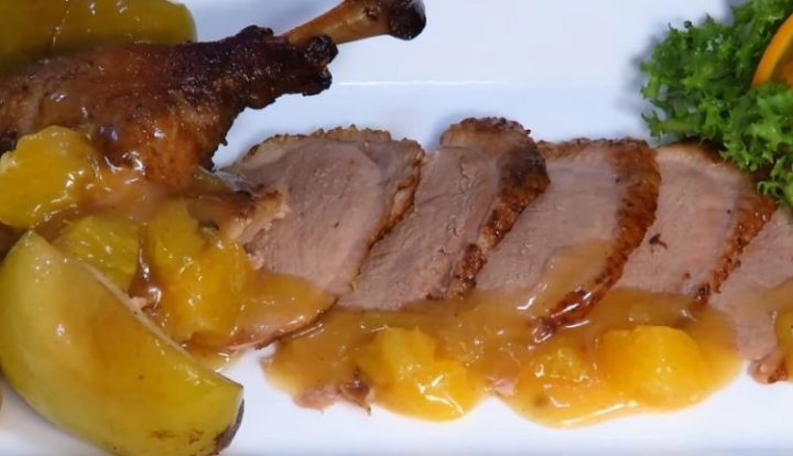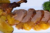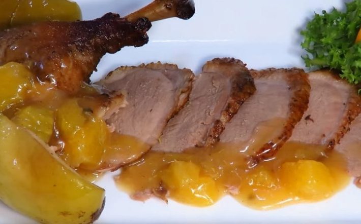 Po dopečení kachnu nechte ještě 20 minut odpočívat a pak podávejte doplněnou o sladkokyselou ovocnou omáčku a ozdobenou plátky čerstvého pomeranče.