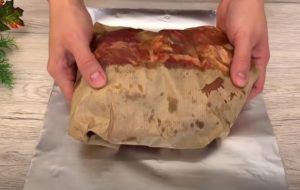 Maso s bramborem potom zabalte do pečicího papíru. Nakonec vše zabalte do alobalu a dejte na pečicí plech. Troubu rozehřejte na 190 °C a pečte maso 60 minut.