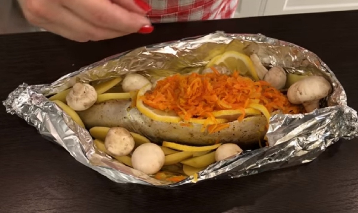 Posléze oloupejte brambory a nakrájejte je na tenčí plátky. Žampiony očistěte a nechte případně vcelku, pokud jsou menší. Případně je můžete překrojit na poloviny. Naplátkovat nezapomeňte ani omytý citron. Nyní si položte okořeněnou makrelu na alobal (2 vrstvy na sobě) a rybu naplňte směsí mrkve a cibule. Okolo masa rozprostřete plátky citronů, brambor a žampiony. Zeleninu ještě dosolte podle potřeby a makrelu pokapejte citronovou šťávou. Nakonec pokrm zabalte pečlivě do alobalu a dejte péct do trouby na 180 °C po dobu 25 minut.